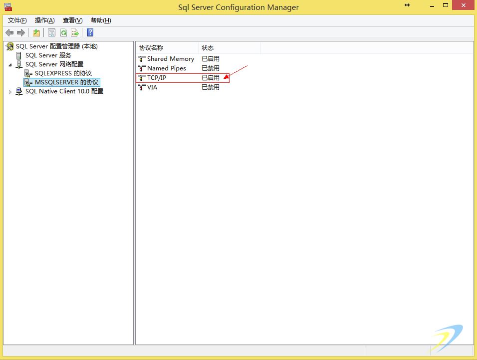 (2)打開(kāi)SQL Server配置管理器后,選擇SQL Server網(wǎng)絡(luò)配置下面的MSSQLSERVER,然后看右邊里面的TCP/IP是否為“已啟用”